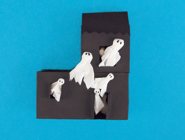 Van zacht Edet Comfort toiletpapier kun je prachtige pluizige spoken maken. De vellen zijn namelijk niet rechthoekig, maar vierkant. Maak eerst propjes van een paar vellen wc-papier. Leg een vierkant vel op elke prop en zet deze vast met een beetje lijm. Teken twee oogjes op de spoken met de zwarte pen en zet ze achter de deuren en ramen van het spookhuis.