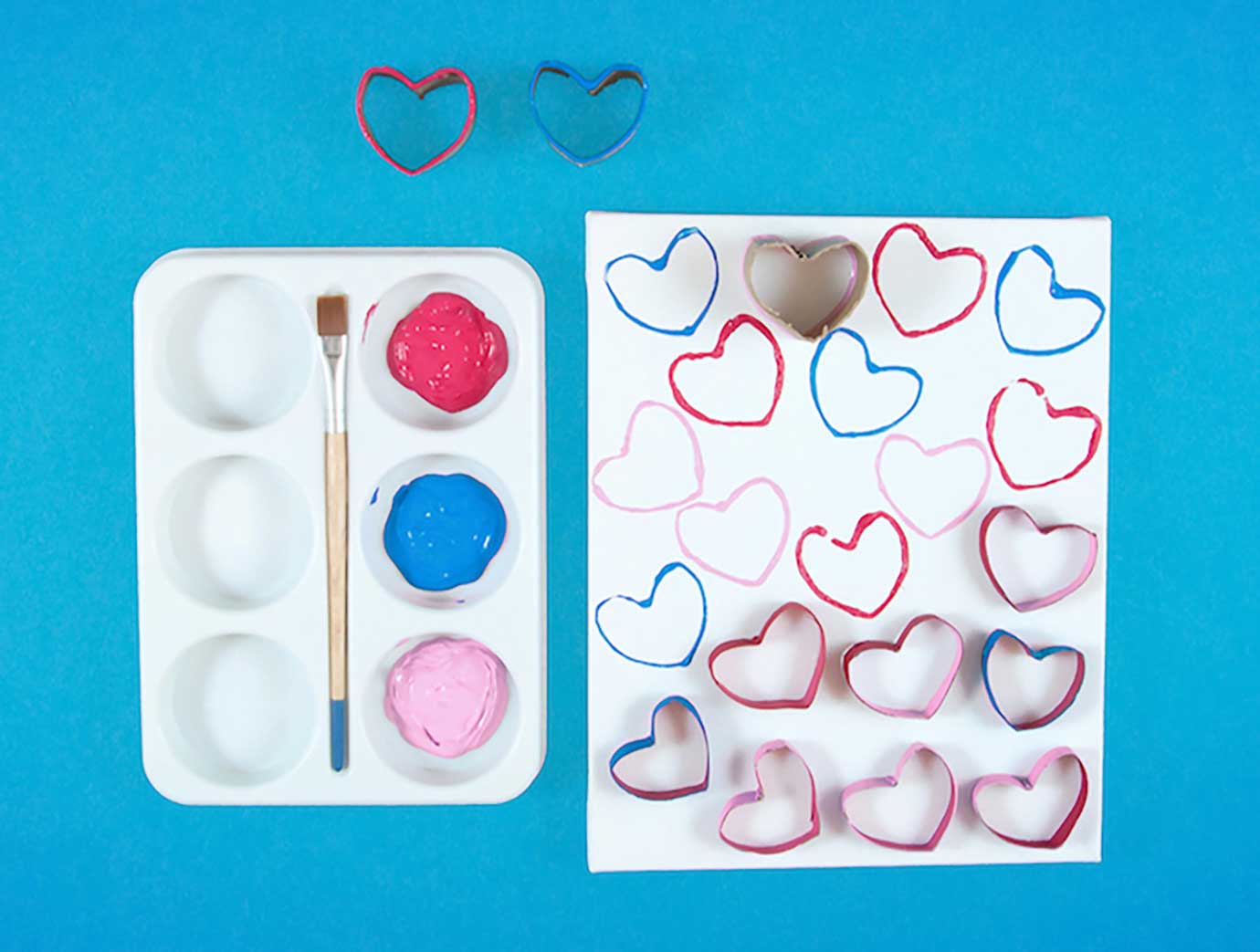Verf de binnen- en buitenkant van deze stukjes in contrasterende kleuren en laat ze drogen. Roze en rood zijn populaire keuzes, maar laat de kinderen vooral hun eigen lievelingskleuren gebruiken.