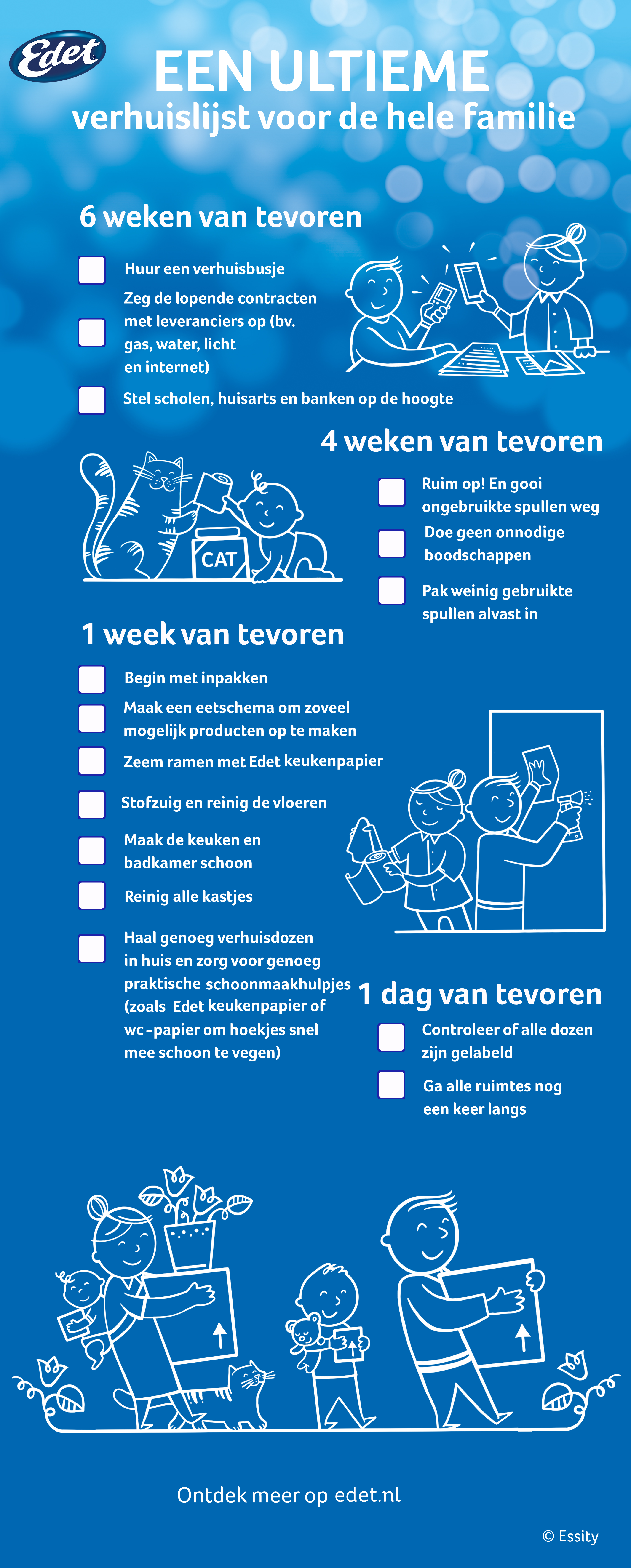 Verhuizen is leuk maar ook zenuwslopend en dat geldt voor de hele familie. Maak het overzichtelijker voor je kinderen (en effectiever voor jezelf) door ze zoveel mogelijk bij de verhuizing te betrekken. Maak ze enthousiast over de verhuizing door over hun nieuwe slaapkamers, de grote tuin of de nieuwe omgeving te praten. Maak er een feestje van!