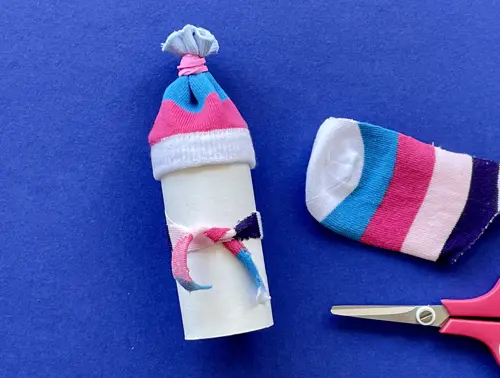 Bind de sok iets hoger vast met een touwtje of een elastiekje om de ‘pompon’ bovenop de muts te maken.