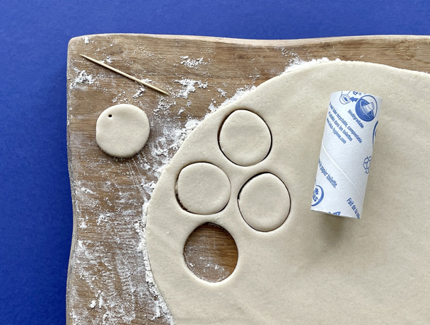 Het is het gemakkelijkst om deze vormen te maken met een set vormpjes voor kerstkoekjes. Aangezien het deeg gemaakt is van eetbare ingrediënten, kun je de koekjesvormpjes later weer gebruiken voor je echte koekjes.